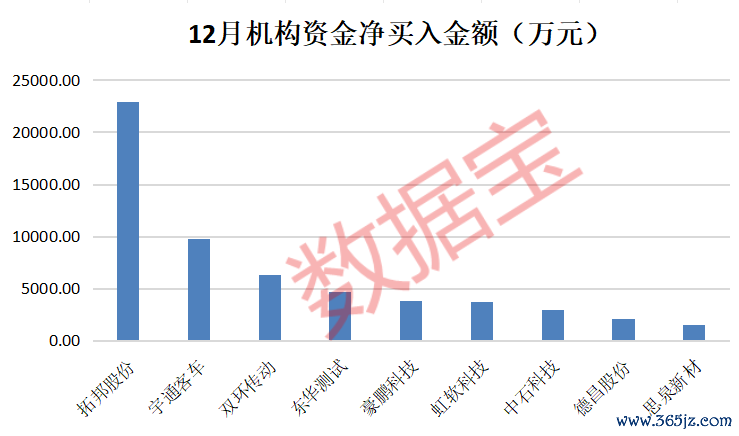 据数据宝统计,上述四大热门科技板块所涉及的潜力股中,12月有9股获机构资金大额买入,净买入金额均超1500万元。